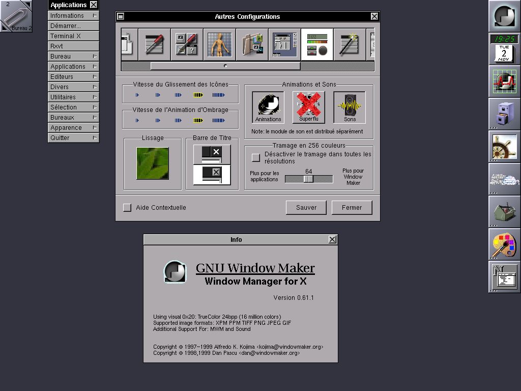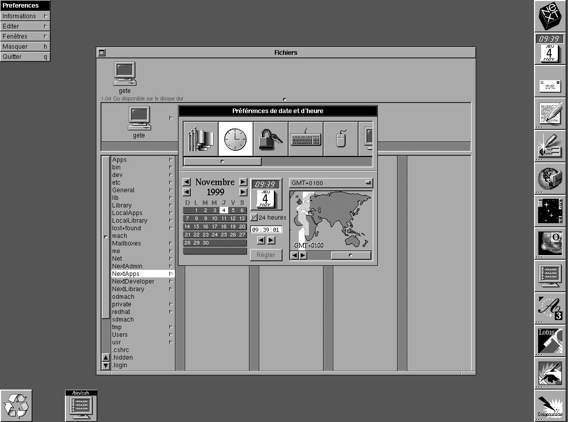 La particularidad de WM heredada del NeXT, es el dock. El dock es la columna de iconos alineados a la derecha de la pantalla. Cada icono sirve para arrancar la aplicación correspondientes con un doble-pinchado. ¿Cómo "dockar" una aplicación? A ustedes les dejo el placer de descubrirlo. ¿Prefieren los menús? Son totalmente configurables, de varias maneras más o menos sofisticadas. Más para descubrir. Todo eso puede ser presentado el idioma elegido.