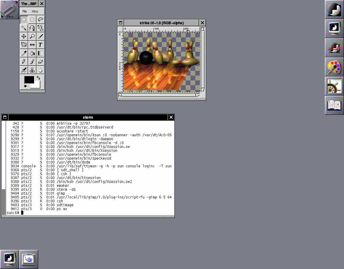 Habrá que llegar a un compromiso entre la resolución y el número de colores dedicado a WM. En WPrefs, los valores por defecto para el modo de 8 bits están bien definidos. Lo mejor es dejarlos así pero nada impide que jueguen con ellos. Sin embargo, cuanto mayor sea la resolución, mejor. Pueden juzgar por las imágenes mostradas abajo (Solaris visualiza en 1152x900 y Amiga en 1280x1024). Para ahorrar los recursos, hay que evitar los fondos de pantalla complejos, eligiendo fondos de un solo color.