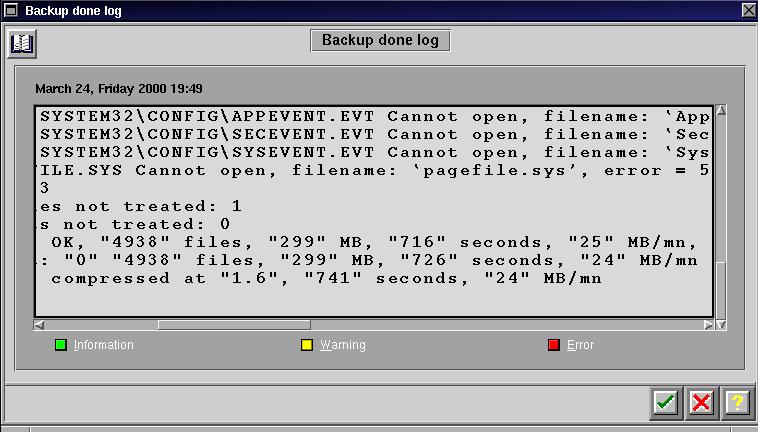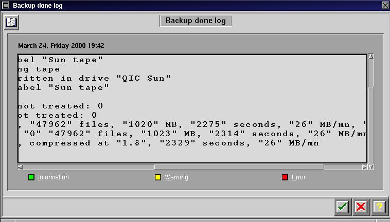 Unos 40 minutos más tarde ya acabó. Cosas importantes: la red es una categoría 5... pero en obras. Significa: los cables no son todos de cat 5, los hubs son 10 o 10/100Mb, sólo unas máquinas tienen verdaderas tarjetas de 100Mb... Sin embargo, hemos almacenado alrededor de 3Gb y unos 150000 ficheros en unos 40 minutos. En una verdadera red cat 5, eso hubiera sido por lo menos 3 veces más rápido. La velocidad depende de muchos elementos: red, ordenadores, streamers, tamaño de las cintas. Nuestro ejemplo es un caso particular y no refleja la fantástica velocidad que pueden alcanzar en ciertas configuraciones. Si la red es una verdadera cat 5, si tienen automátas, si utilizan DAT, si los ordenadores són muy rápidos... pueden esperar unos 70 Mb/min. En nuestro ejemplo, la media es alrededor de 25 Mb/min. Eso para cada almacenamiento. Considerando que están hechos al mismo tiempo da unos 100Mb/min.