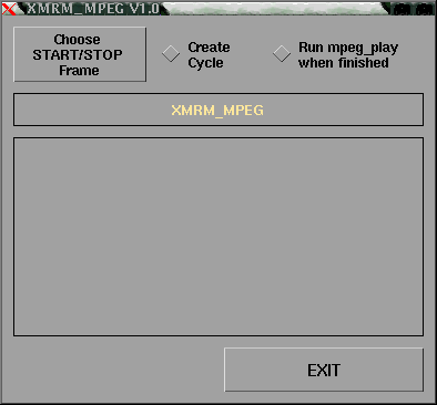 Esta caja de diálogo se obtiene pulsando "Execute xmrm_mpeg". Con ayuda del botón "chose start/stop frame" elegir la primera y la última imagen de la animación. Pulsando "GO" se obtiene la animación en mpeg que se podrá reproducir con mpeg_play.