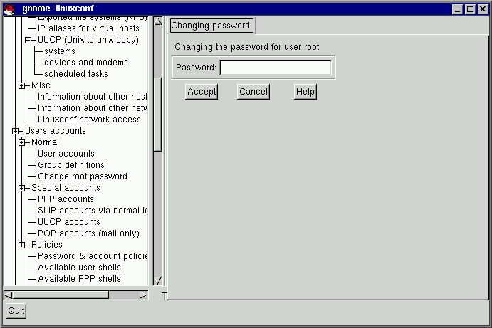 La pantalla es un poco confusa porque ni su título ni la descripción explican realmente su propósito. Linuxconf parece estar preguntando por la nueva clave, lo cual no es el caso. En su lugar, Linuxconf quiere la clave actual del root para verificar el acceso a la cuenta de root. Linuxconf necesita privilegios de root para ser ejecutado, pero una vez en ejecución nada impide que alguien se siente en el ordenador si la persona que está usando Linuxconf se ausenta un minuto. ¡Hay gran cantidad de peligros potenciales! Si la persona que estaba usando Linuxconf originalmente sale de su cuenta, no podrá volver a entrar como root. La falta de validación le daría además control completo sobre la computadora a quienquiera que cambiase la clave de root.