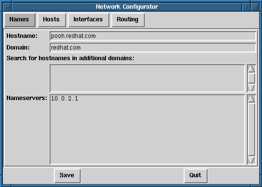Se puede agregar, eliminar, configurar, activar, desactivar y poner alias a los dispositivos de red. Vienen soportados los dispositivos Ethernet, arcnet, token ring, pocket (ATP), PPP, SLIP, PLIP y loopback. El soporte de PPP/SLIP/PLIP funciona bien en la mayoría del hardware, pero algunas configuraciones particulares pueden mostrar un comportamiento impredecible. Cuando estés usando la Network Configuration Tool pulsa sobre Save para escribir los cambios al disco, para salir sin hacer cambios, selecciona Quit.