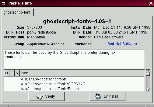 Debajo de la descripción hay una lista de los ficheros contenidos en el paquete. Si una letra D aparece en la columna correspondiente a la izquierda del camino, dicho fichero es un fichero de documentación y puede ser una buena idea leerlo para recibir ayuda acerca del uso de la aplicación. Si una letra C aparece en la columna correspondiente, se tratará de un fichero de configuración. Bajo la columna S, puede ver el ``estado'' del paquete; ahí, recibirá información si cualquier fichero aparece como ``desaparecido'' en el paquete (y en consecuencia probablemente signifique que hay un problema con el paquete).