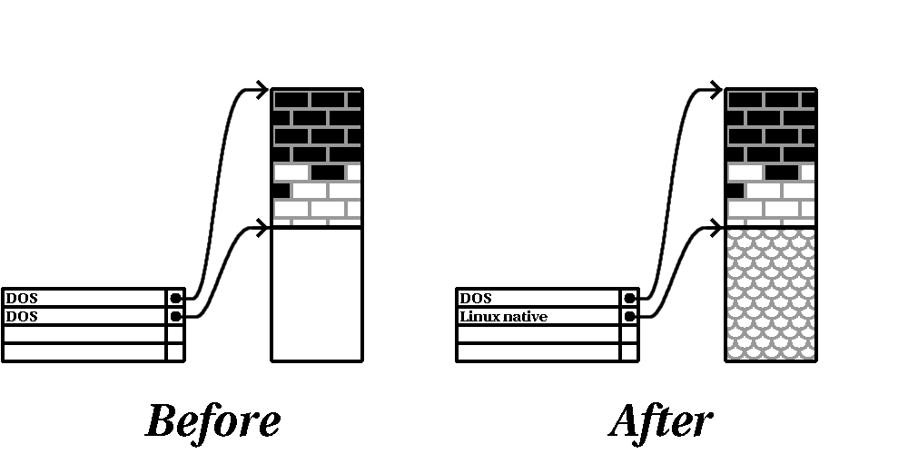 - Tal y como implica el paso previo, puede o no ser necesario crear nuevas particiones. De cualquier modo, a no ser que el software para redimensionar la partición esté preparado para Linux, es probable que necesite borrar la partición creada durante el proceso. La figura fig:b4-nondestructive-final muestra cómo se hace.