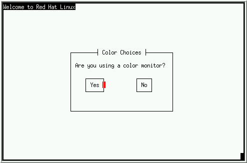 Después de arrancar, el programa de instalación empieza preguntando si estás usando un monitor de color (ver Figura 6). Yes es el valor por defecto -- deberías ver un cursor o puntero al lado del botón Yes. Si no lo ves pulsa [Tab] una vez para seleccionar No, y entonces [Enter] para proceder.