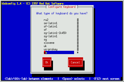 Después del diálogo de bienvenida, el programa de instalación te da la oportunidad de seleccionar el tipo de teclado (ver Figura 7). Usando las teclas [\uparrow] y [\downarrow], selecciona el tipo de teclado apropiado para tu sistema Red Hat Linux. Observa la barra de desplazamiento a la derecha de los tipos de teclado -- indica que hay más tipos de los que pueden ser presentados de una vez. Estarás viendo barras de desplazamiento como esta a lo largo de todo el programa de instalación.