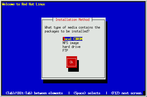 Una vez que tu unidad CD-ROM ha sido identificada, te pedirá que insertes el CD-ROM de Red Hat Linux en la unidad de CD-ROM. Selecciona Ok cuando hayas hecho eso. Después de un momento, aparece la siguiente ventana de diálogo. Pasa al Capítulo 4 para continuar instalando Red Hat Linux.
