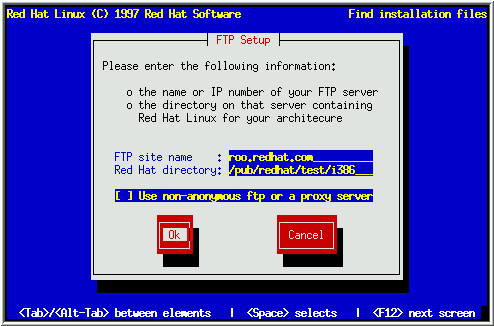 /pub/mirrors/redhat/i386. Si no estás usando FTP anónimo, o si necesitas usar un servidor FTP proxy (si estás detrás de un 'firewall', por ejemplo), activa el cuadro de chequeo, y otra ventana de diálogo te pedirá la cuenta FTP y la información del proxy.