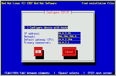 Las instalaciones basadas en NFS y FTP son similares, ya que ambas requieren información relativa a la red. Por esta razón, las trataremos juntas. Marca el método de instalación que prefieras, selecciona OK, y pulsa [Space]. Si estás haciendo una instalación NFS, salta a 3.4.4. Si estás haciendo una instalación FTP, sigue leyendo.