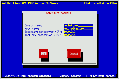 Después de la primera ventana de diálogo, puedes ver otra. Te preguntará por un nombre de dominio, un nombre de host, y otras informaciones de red (ver Figura 12). Teclea el nombre de dominio para tu sistema y pulsa [Enter]; el programa de instalación lleva el nombre de dominio al campo Host name. Teclea el nombre de host que estás usando en frente del nombre del dominio para formar un completo nombre de dominio cualificado (FQDN). Si tu red tiene más de un servidor de nombres, puedes teclear direcciones IP para estos servidores de nombres adicionales en los campos Secondary nameserver y Tertiary nameserver. elige OK para continuar.