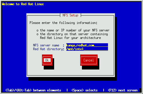 13). Teclea el nombre o dirección IP de tu servidor NFS, y el nombre del directorio exportado que contiene el CD Red Hat Linux. Por ejemplo, si el servidor NFS tiene el CD Red Hat Linux montado sobre /mnt/cdrom, teclea /mnt/cdrom en Red Hat directory.