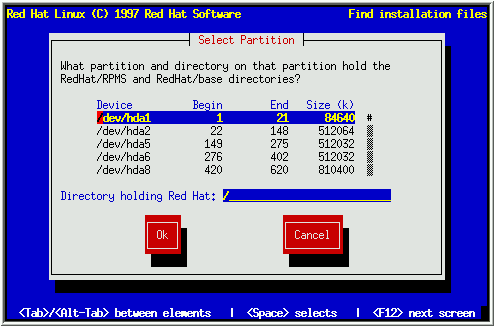 En este punto, una ventana de diálogo titulada ``Select Partition'' es presentada (ver Figura 14). Teclea el nombre del disposivo de la partición que tiene el árbol de directorios de RedHat. Hay también un campo llamado ``Directory''. Si el directorio RedHat no está en el directorio raiz de esta partición (por ejemplo, /test/new/RedHat), teclea el camino hasta el directorio RedHat (en nuestro ejemplo, /test/new).