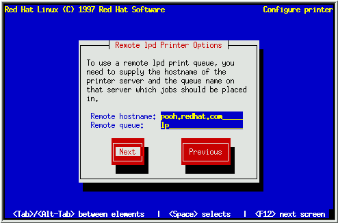 Escriba el nombre de la computadora a la cual la impresora está directamente conectada en el cambpo ``Remote hostname''. El nombre de la cola en la computadora remonta que está asociada con la impresora remota va en el campo ``remote queue''. Seleccione Next, y presione [Espacio]. Ahora vaya a la sección 5.6.4 para continuar.