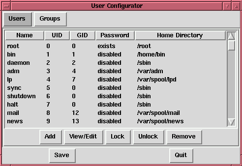 La herramienta que se muestra en la Figura 49 administra los usuarios y grupos en su sistema. En cierto modo, es un editor gráfico para los ficheros /etc/passwd y /etc/group, y para /etc/shadow si está usando el modo de contraseñas escondidas (shadow passwords). Con esta herramienta Ud. podrá agregar y quitar usuarios y grupos, configurar el intérprete de órdenes al ingreso, los nombres completos, directorios de usuario (HOME), uid, gid, etc.