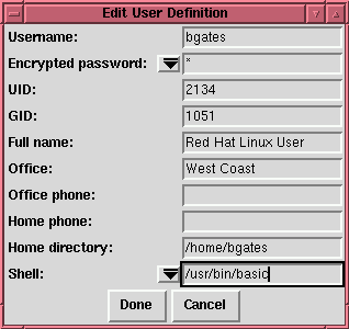 Ud. necesita ocuparse de la contraseña. Hay cinco opciones en el menú Encrypted Password (contraseñas cifradas): ``Original'', ``Change'', ``No Password'', ``Lock'', y ``Unlock''. ``No Password'' equivale a sin contraseña, y es una opción pésima --- si no tiene contraseña, cualquier persona puede ingresar a su sistema utilizando este id. Si elige ``Lock'' (acerrojar) nadie podrá ingresar a esa cuenta, pero mantiene la contraseña existente, de manera que más adelante se pueda reabrir nuevamente; ``Unlock'' (descerrajar) reabre las cuentas cerradas con ``Lock''. ``Original'' está en blanco (igual a ``No Password'') cuando está agregando un nuevo usuario, y contiene la contraseña actual del usuario cuando se edita un usuario existente. En general, Ud. seleccionará la opción ``Change'' (cambiar). Aparecerá una pequeña caja de diálogo, donde se le solicitará que ingrese la contraseña y luego la confirme al escribirla por segunda vez. Haga clic en el botón Done de la ventana de ingreso de contraseña para confirmar que ha escrito correctamente la contraseña.