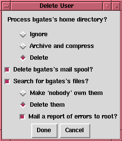 Para quitar un usuario, haga clic sobre él para seleccionarlo en la ventana principal y luego haga clic sobre el botón Remove. Se le mostrará la caja de diálogo que se ve en la Figura 51. Hay tres clases de cursos de acción que Ud. puede tomar. Puede ignorar el directorio personal (HOME) del usuario y dejarlo allí donde esté; puede archivarlo y comprimirlo generando un fichero .tar.gz, o puede borrarlo completamente. Puede borrar asimismo la cola de mensajes de correo electrónico del usuario. Las primeras dos acciones se ejecutarán inmediatamente apenas confirme Ud. el borrado, antes de que la herramienta le pida más datos. Puede buscar ficheros de propiedad del usuario y que residan en lugares del sistema de ficheros que no sean su directorio personal, y luego puede pasarlos a propiedad del usuario nobody o bien puede borrarlos. Si Ud. decide realizar la búsqueda de los ficheros de propiedad del usuario, tiene la opción de escoger que se envíe un informe por correo electrónico al usuario root con los errores. Esto es importante pues la búsqueda se realizará en segundo plano, a medida que Ud. continua con su trabajo, y puede tardar un largo rato. Para encontrar los ficheros de propiedad de nobody, ejecute la siguiente órden:
