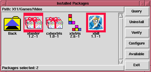 El menú sensible al contexto de un paquete permite también una sencilla selección y deselección. El uso de las opciones select y unselect en un icono de paquete selecciona o deselecciona ese paquete, mientras que esas opciones en un icono de carpeta de grupos selecciona o deselecciona todos los paquetes de ese grupo. El uso de esas opciones de menú hacen la selección de grupos de paquetes mucho mas rápida que la selección individual de cada paquete.