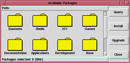 Para ver que paquetes están disponibles para su instalación, escoge el botón Available en la ventana de glint. Después de unos instantes, una nueva ventana, como la mostrada en la figura 71, aparecerá. Las diferencias en el titulo y los botones indican que esta ventana presenta los paquetes que puedes instalar. Navegar por esos paquetes y seleccionarlos se hace de la misma manera que en las otras ventanas de glint.