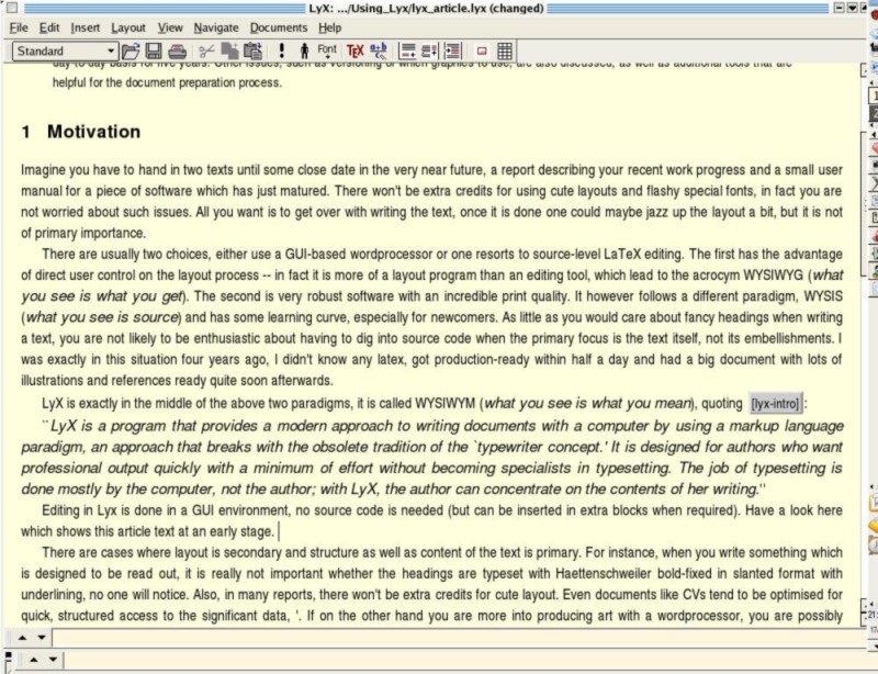 Habitualmente tiene dos opciones: o bien utiliza un procesador de textos basado en una interfaz gráfica o bien recurre a la edición de código fuente en LATEX. La primera tiene la ventaja de que se controla directamente el proceso de presentación: en realidad, se trata más bien de un programa de presentación que de una herramienta de edición, lo que dio lugar al acrónimo WYSIWYG (what you see is what you get - lo que ves es lo que obtienes). La segunda es un software muy robusto con una muy alta calidad de impresión. Sigue sin embargo un paradigma diferente, WYSIS (what you see is source - lo que ves es el código fuente) y tiene algunas dificultades de aprendizaje, sobre todo para los neófitos. Como al escribir el texto no le preocupa hacer bonitos encabezamientos, probablemente no le entusiasmará la idea de complicarse trabajando en código fuente, ya que el foco de interés es el propio texto, no los adornos y etiquetas. Me encontré precisamente en esa situación hace cuatro años: no sabía nada de LATEX, pero en una mañana día estuve ya preparado para comenzar y en poco tiempo tuve listo un extenso documento con montones de ilustraciones y referencias, todo gracias a LyX.