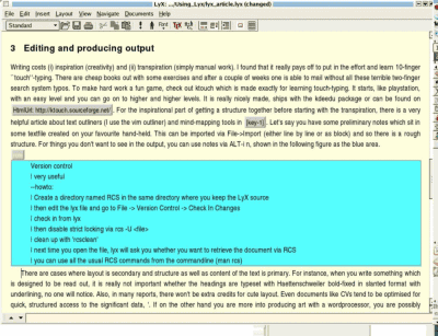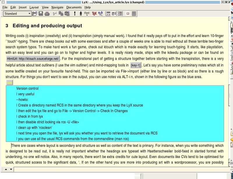 Esto es especialmente útil cuando el texto es largo y se modifica unas cuantas veces. LyX viene ya preparado para el RCS, es fácil activarlo.