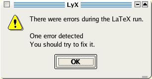 Cuando la compilación de LaTeX falla, aparece una ventana de error como esta de la izquierda. Generalmente, la localización de errores dependiente del contexto es bastante buena, y puede saltar al error, marcado en su documento con una caja roja, mediante CTRL-g. Si esto no le ayuda, eche un vistazo a la salida estándar de error (suponiendo que haya arrancado LyX desde un terminal xterm) o pruebe Ver -> Archivo de registro de LaTeX. En algunos casos puede tener problemas porque un determinado estilo de documento no estaba incluido (p. e., 'package xyz not found'). Esto puede arreglarse fácilmente añadiéndolo en el preámbulo de Latex, que hace para los documentos de Latex la misma función que la sección <head> para el HTML, esto es, declarar los archivos de estilo, añadidos etc. Para acceder al preámbulo seleccione Formato -> Documento -> Preámbulo. Por ejemplo, puede añadir: