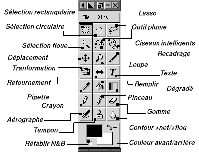 Esta paleta de herramientas es la que corresponde a la versión estable 1.0.4, pero, siempre resulta interesante instalar las versiones más recientes, por ejemplo la versión 1.1.9 , que no presenta ningún problema de instalación (bajo Red Hat 6.0), y que posee 6 útiles adicionales, nuevas posibilidades para las herramientas de pluma, un sistema de navegación para cuando hacemos zoom ...