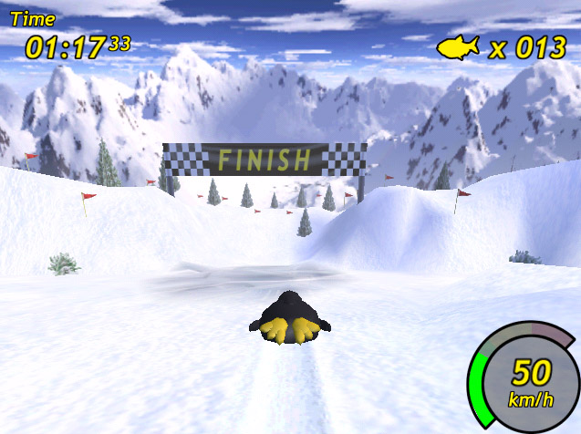 Während des Rennens sieht man Tux quasi über die Schultern, während dieser auf dem Bauch die Hänge hinuntergleitet. Mit den Pfeiltasten wird gesteuert (links/rechts), beschleunigt und gebremst (hoch/runter). Ausserdem kann der knuddelige Schwarz-Weisse auch springen (e). Durch betätigen der Steuertasten (links/rechts) während gebremst wird, fährt Tux eine scharfe Kurve, die ihn gleichzeitig bremst. Wenn nötig kann man den armen Kerl auch mittels Backspace Taste wieder auf den rechten Weg bringen, sollte er sich irgendwo verheddert haben. Wer mag, kann die Tastenbelegung ändern oder auch mit einem Joystick steuern.