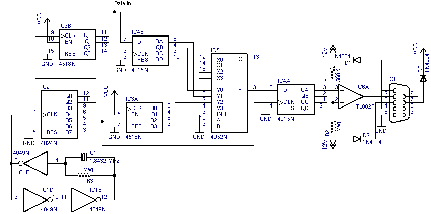 Eine Hälfte des TL082 Operationsvertärkers stellt eine Konvertierung von CMOS nach RS-232 zur Verfügung. Die Widerstandsteiler R1, R2 richten die negative Eingabe auf ungefähr 3 Volt. Sobald der Ausgang des 4015-Registers über und unter 3 Volt ist, schaltet der Ausgang des Operationsverstärkers auf positive und negative Stromversorgung. Wichig ist, daß die Bitmusterdaten auf der RS-232-Leitung invertiert werden und die datenlesende Software muß diese Umkehrung berücksichtigen.