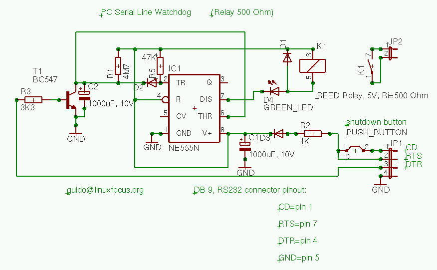 Nu een blik op het schema van onze schakeling: we gebruiken de RTS pen voor de voedingsspanning. De voltages op de seriële lijn RS232 zijn +/- 10V, daarom gebruiken we een diode voor condensator C1. De condesator C1 laadt erg snel, en dient als energie-opslag om het relais in staat te stellen de schakelaar voor een moment in te schakelen. Condensator C2 laadt erg langzaam over de 4.7M Ohm weerstand. De transistor T1 ontlaadt de condensator C2, als het een korte puls ontvangt via de RS232 DTR pen. Als de puls niet komt (omdat de computer vastgelopen is), zal condensator C2 uiteindelijk (na zo'n 40 seconden), geladen worden tot boven 2/3 van de voedingsspanning en de Flipflop gaat 'aan'.