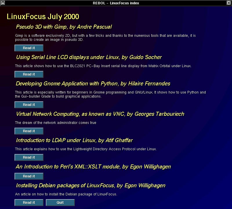 door Georges Tarbouriech <georges.t(at)linuxfocus.org> Over de auteur: Georges gebruikt al lang Unix (zowel commerciële als gratis versies). Vanaf het begin is hij een Rebol fan. Als je Frans kunt lezen kun je eens naar een artikel kijken dat hij twee jaar geleden over Rebol schreef op http://www.amiganews.com/ANN/ no117/rebol.shtml Vertaald naar het Nederlands door: Mylène Reiners <mylene.reiners(at)cmg.nl> Inhoud: |