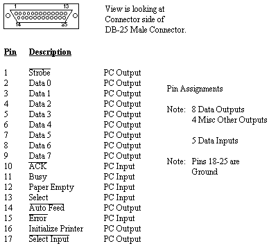 [One might ask why the designers of the printer port designed the port in this manner. Assume you have a printer with no cable attached. An open usually is read as a logic one. Thus, if a logic one on the SELECT_IN, AUTOFEED and STROBE leads meant to take the appropriate action, an unconnected printer would assume it was selected, go into the autofeed mode and assume there was data on the outputs associated with the Data Port. The printer would be going crazy when in fact it wasn't even connected. Thus, the designers used inverted logic. A zero forces the appropriate action.]