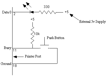 Normally open push-button causes +5V (logic 1) to appear on input BUSY (STATUS PORT - Bit 7). When depressed, push-button closes and ground (logic 0) is applied to input Busy.