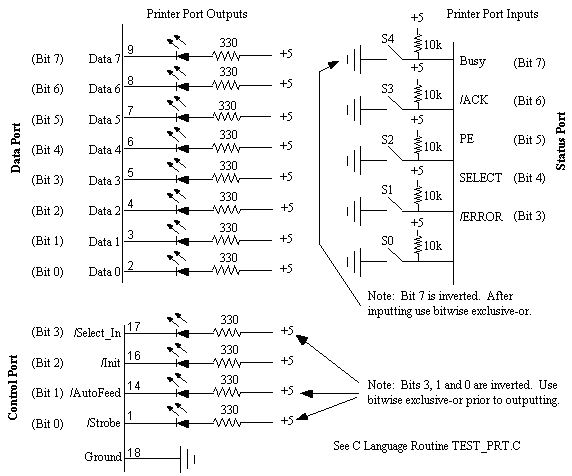 Refer to the figure titled Figure #4 - Printer Port Test Circuitry. This illustrates a very simple test fixture to allow you to figure out what inversions are taking place in the hardware associated with the printer port. Program test_prt.c sequentially turns each of the 12 LED's on and then off and then continually loops to display the settings on the five input switches.