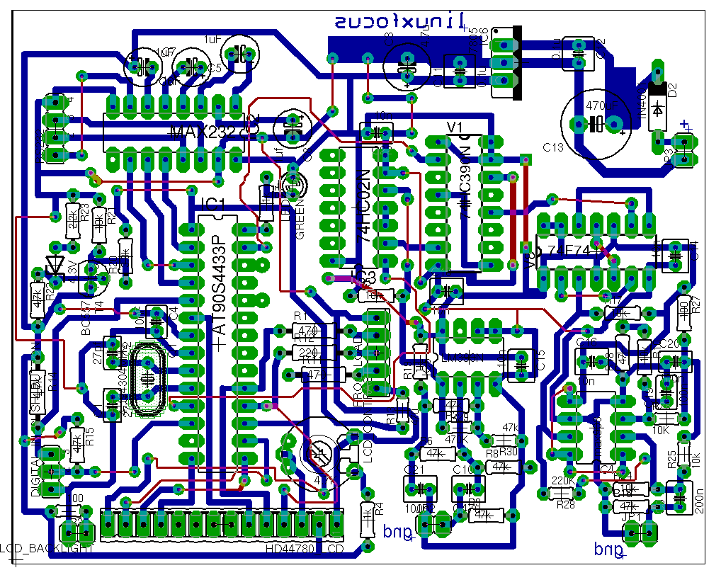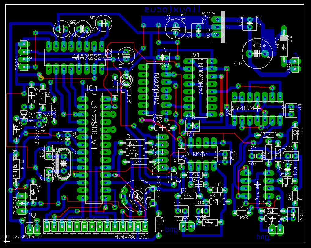 Ich habe eagle für Linux benutzt, um Schaltplan und Platine zu entwickeln. Das Programm hat etwas Probleme, zu verstehen, daß all die unterschiedlichen Stromversorgungsanschlüsse von den ICs immer 5V sind. Man erhält deshalb eine Fehlermeldung, wenn man den "electrical rule check" benutzt. Der Entwurf ist jedoch richtig.