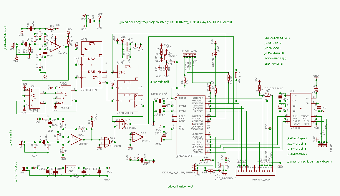 Falls du nur Frequenzen bis 1.5Mhz messen möchtest (z.B. um den Frequenzgang des Verstärkers deiner Stereoanlage zu messen), kannst du auch eine vereinfachte Version bauen und MAX903, 74F74 und den 74hc390 weglassen. Die Software bleibt die gleiche, die Platine muß man auch nicht unbedingt ändern.