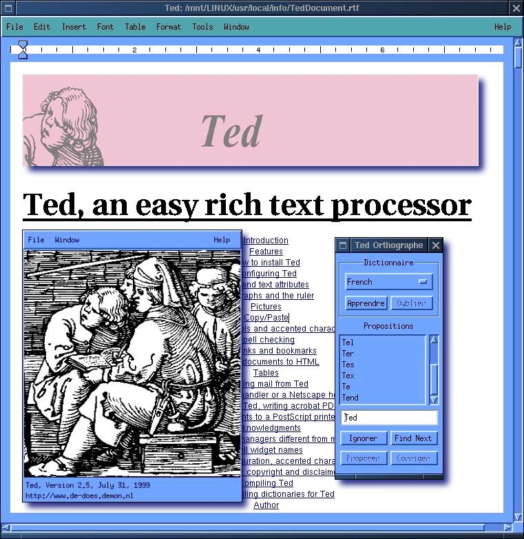 The TED can be downloaded as archive from <ftp://ftp.nluuq.nl/pub/editors/ted> or <http://www.de-does.demon.nl> or <http://www.nllgg.nl/Ted/>. TED is available in binary format (statically linked) or as source code. The later is 1,9 MB (ted-2.8.src.tar.gz) in size and needs Motif for compilation. My experience is that Lesstif.0.88-9 produced also very good results. After compilation and striping (command strip) the binary you get a 1 MB big executable. The Ted contains also a spell checker in american English. Different dictionaries for other languages can be downloaded separately. In addition to binary/source-tar archives TED is also available as RPM package.